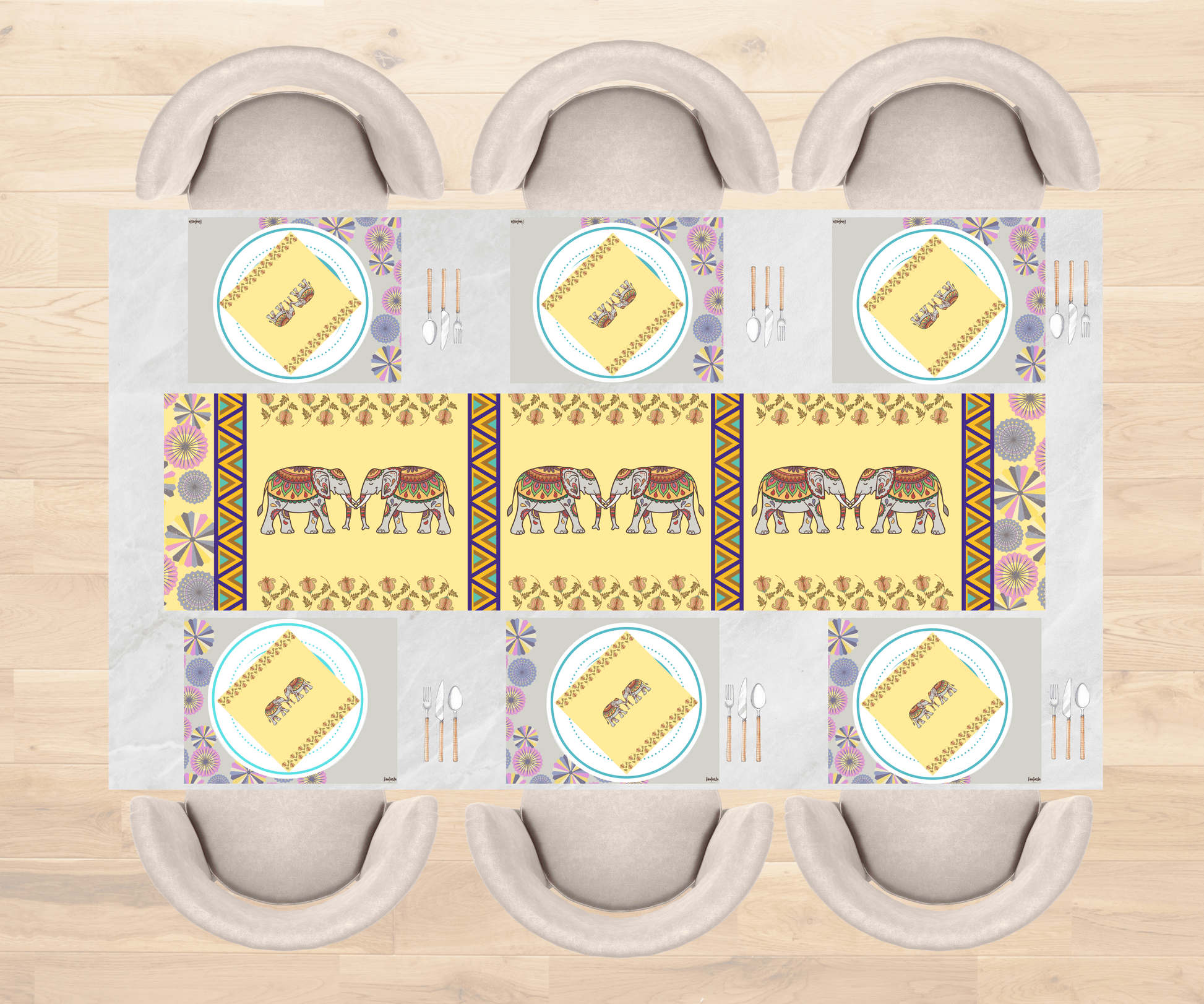 Bring a touch of heritage to your table with this vibrant linen set featuring ornate elephants, paisley accents, and tribal borders — a perfect blend of tradition and elegance.